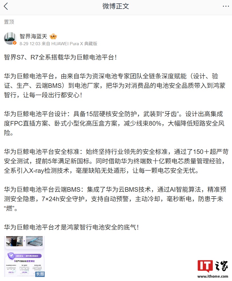 8月31日,智界产品总监@智界海蓝天分享了鸿蒙智行智界S7、R7汽车全系搭载华为巨鲸电池平台的消息。该平台由华为资深电池专家团队全链条深度赋能,包括设计、验证、生产、云端BMS等环节。华为巨鲸电池平台具备15层硬核安全防护,通过高集成度FPC直插方案和卧式小型化高压盒方案,减少线束80%,降低短路安全风险。平台已通过150多项严苛安全测试,提前5年满足新国标,并引入X-ray检测技术,实现毫厘缺陷检测。