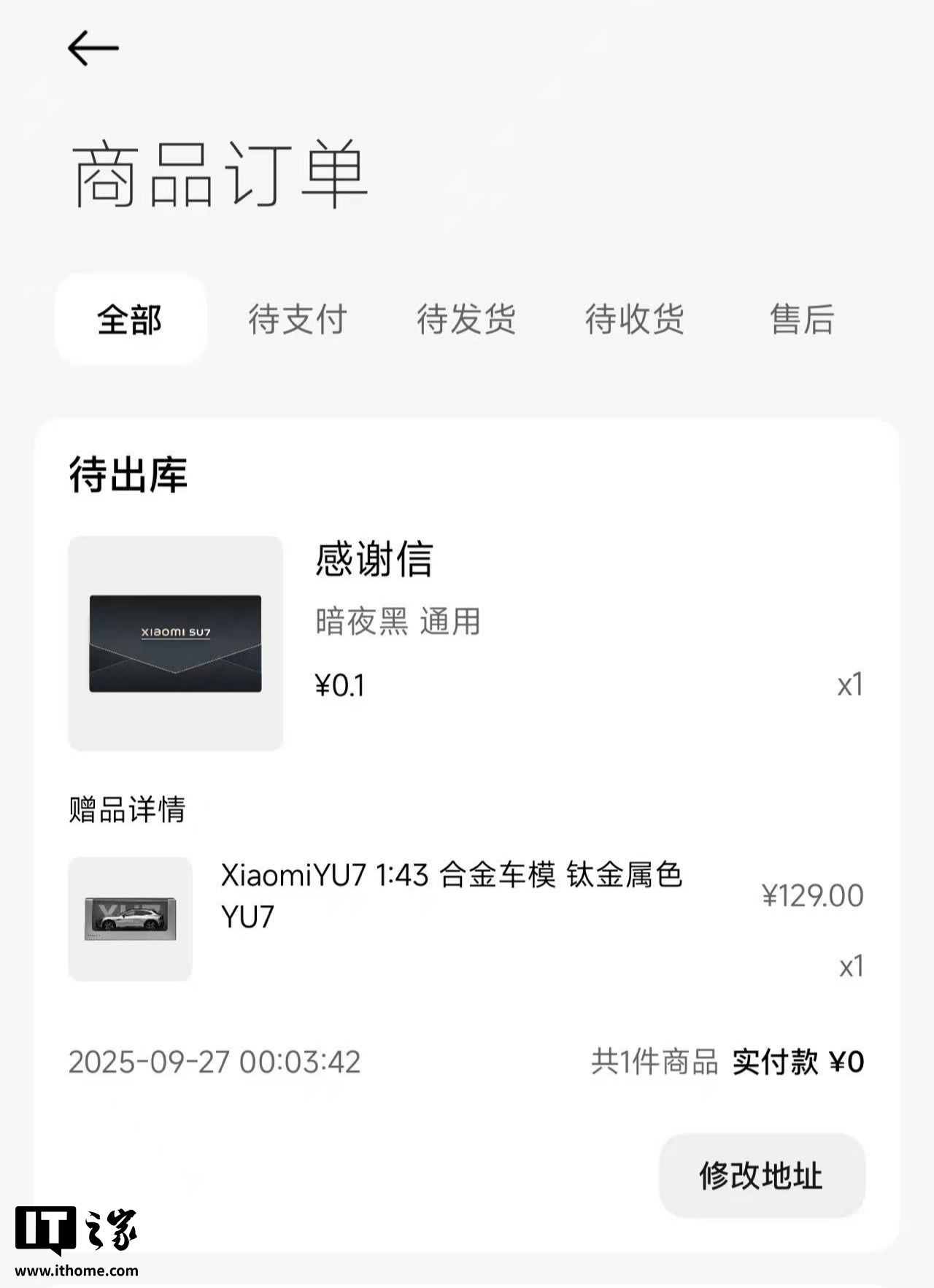9月27日,小米汽车针对部分YU7车型的锁单等待用户推出了关怀活动。自9月20日起,对于锁单到交付实际等待周期超过3个月的用户,小米汽车将不定期送出小礼品,以表达对用户耐心等候的感谢。据悉,活动的第一件礼品是一款价值129元的小米YU7 1:43合金车模,同时附上一封感谢信。