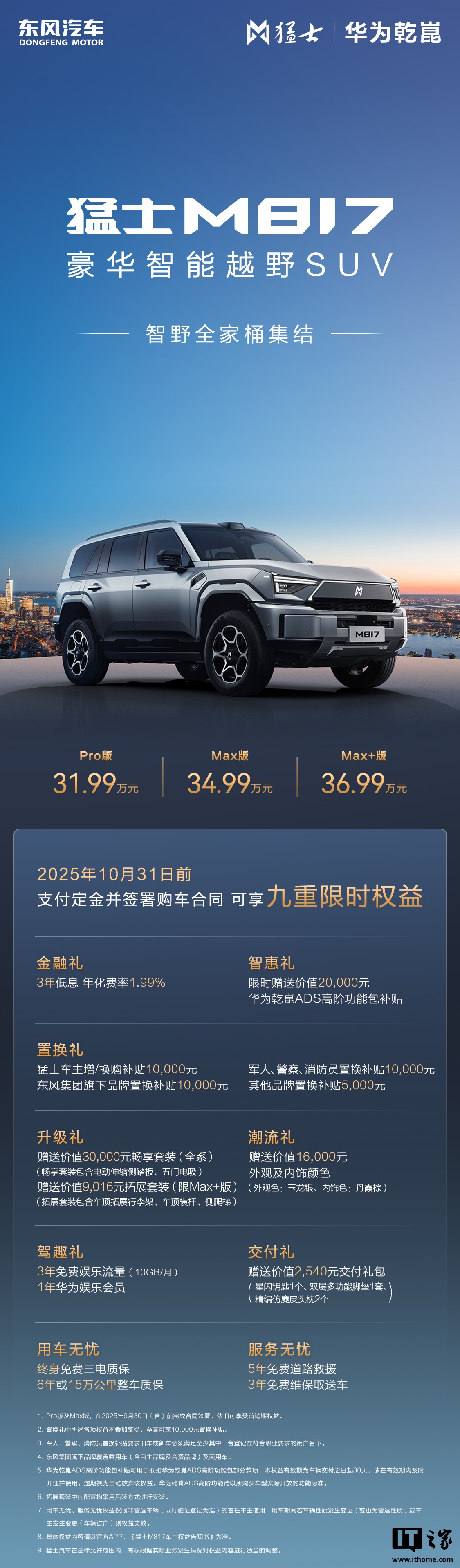 9月29日,东风汽车旗下猛士汽车品牌宣布猛士M817 Max+版越野SUV正式上市,售价36.99万元。此前已上市的Pro版和Max版售价分别为31.99万元和34.99万元。为吸引消费者,品牌推出限时优惠活动,10月31日前支付定金的客户可享受金融礼、智慧礼、置换礼、升级礼等九重限时权益。