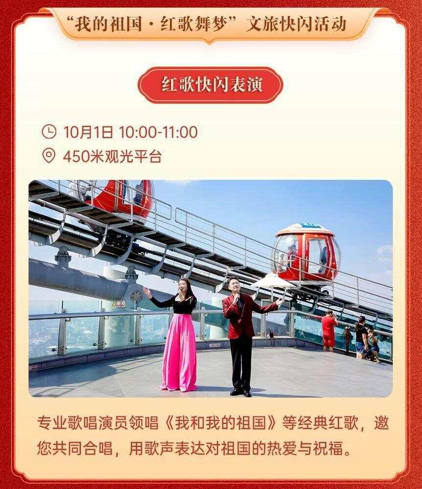 据悉,广州塔旅游区在国庆假期期间,将举办“我的祖国·红歌舞梦”文旅快闪活动。10月1日和10月2日到访广州塔旅游区的游客,可在450米观光平台、登塔大厅、二楼轮候区等地,看到民族舞蹈快闪、民族服饰巡游、红歌快闪等活动的举办。相关活动具有互动性,游客既可观看,也可跟着演员一同参与。