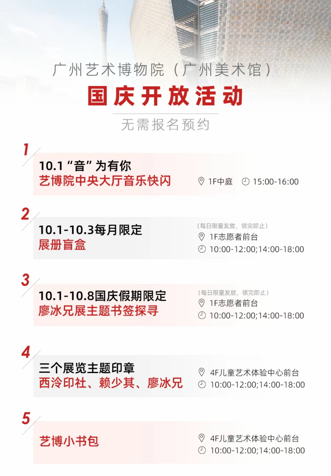除了全面对公众开放免预约的活动,广州艺术博物院(广州美术馆)在国庆中秋假期,还将举办多个预约活动和展览,公众可通过微信公众号“广州艺术博物院|广州美术馆”,查阅该院的活动信息。