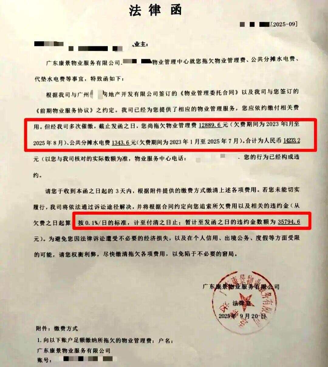 近日,广东康景物业服务有限公司(以下简称“康景物业”)下辖的广州某小区物业中心,向其一名业主发出了一封法律函,就该业主长期拖欠物业管理及相关费用事宜进行正式催缴,并提示了可能引发的法律诉讼及高额违约金风险。此事一经披露,立即在广州市各大小区业主群,尤其是进驻有康景物业的多个知名小区业主群引起热议。法律人士表示,高额违约金并非“法律函”能裁定,若业主对此不服,可从法律途径解决。