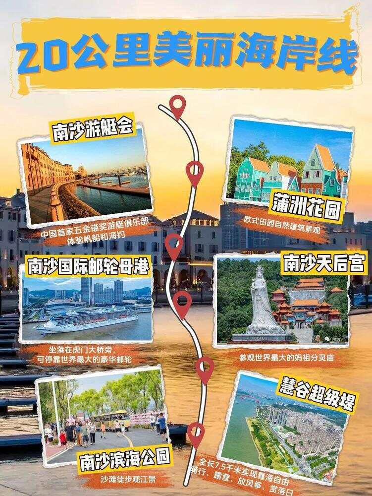 推荐路线:南沙游艇会→蒲洲花园→广州南沙国际邮轮母港→南沙天后宫→南沙滨海公园→南沙慧谷超级堤