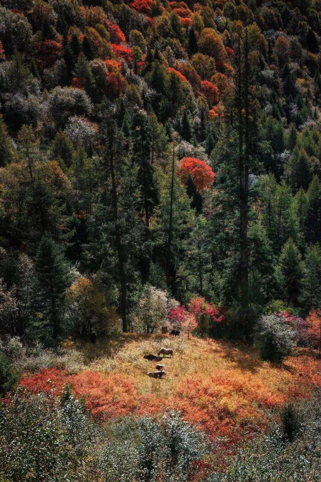 终年苍翠的密林中,夹杂着点点橙黄搭配着山下的金黄草甸,为总是深沉的颜色平添了一丝温暖的色调。