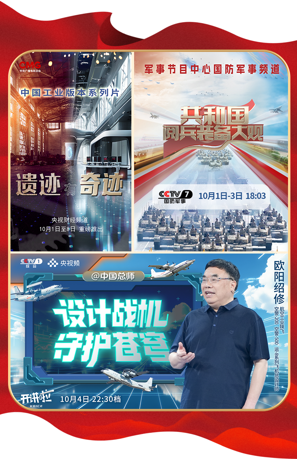 纪录片《遗迹有奇迹》,深入探访八个不同行业的工业遗址,展现中国工业发展的辉煌历程。九三阅兵现场,新型察打一体无人机、空警-500预警机等硬核装备令人振奋,《开讲啦》“@中国总师”解读中国军工硬核实力,系列节目《共和国阅兵装备大观》带你在钢铁洪流的轰鸣声中见证军工装备的迭代升级,展示新时代中国科技创新带来的大国力量!向前进,向前进,我们有信心、有底气!