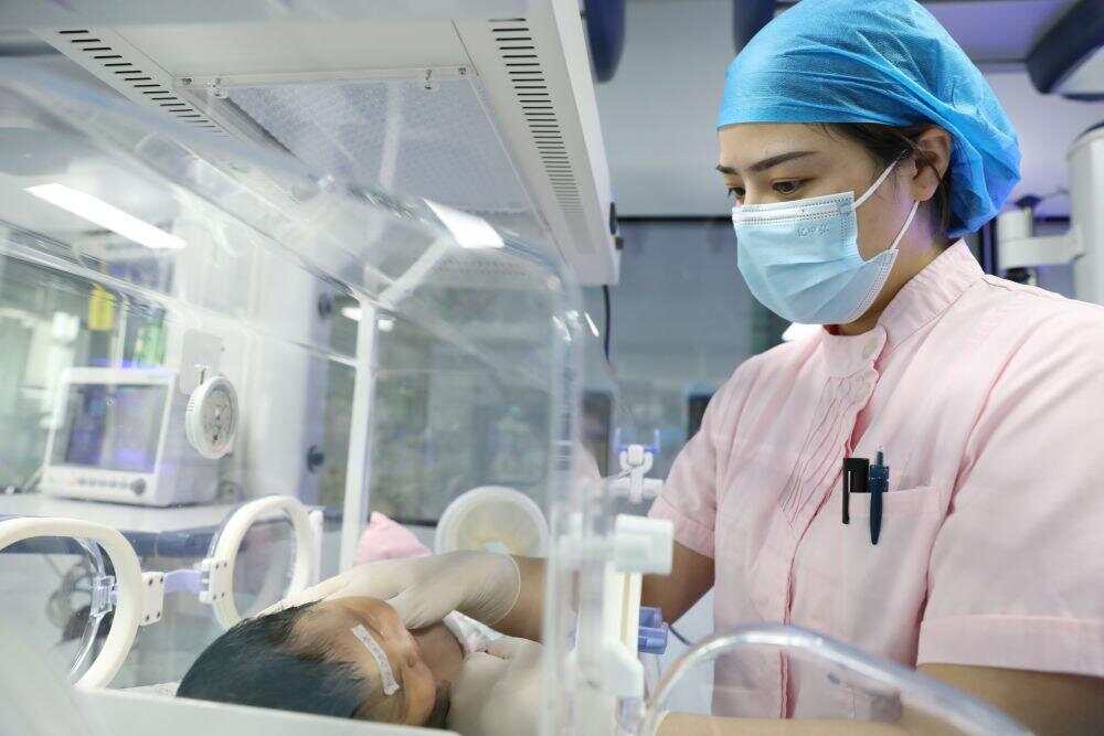 10月1日,河南省焦作市温县妇幼保健院护士在给新生儿做护理。新华社发(徐宏星摄)