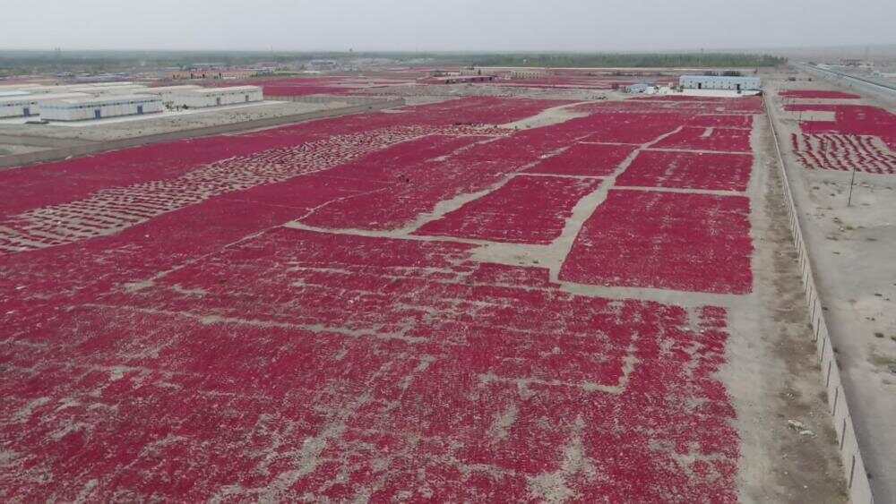 在距离沙湾市数百公里外的焉耆县,14万亩辣椒进入了采收晾晒的关键期。戈壁晒场被火红的辣椒铺满,远远望去,宛如给大地铺上了一层红色的地毯。农民沙尼亚·艾海提今年种植了600亩辣椒,眼下正是她最忙碌的时候。