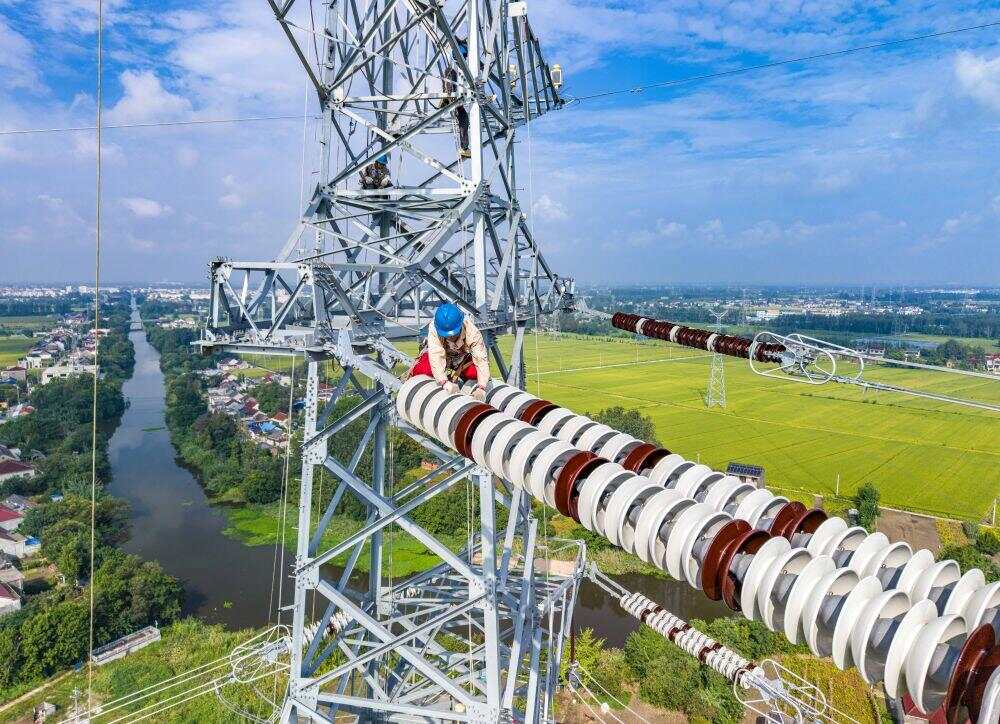 10月1日,电力人员在扬州-镇江±200千伏直流输电二期工程施工现场作业(无人机照片)。新华社发(任飞摄)