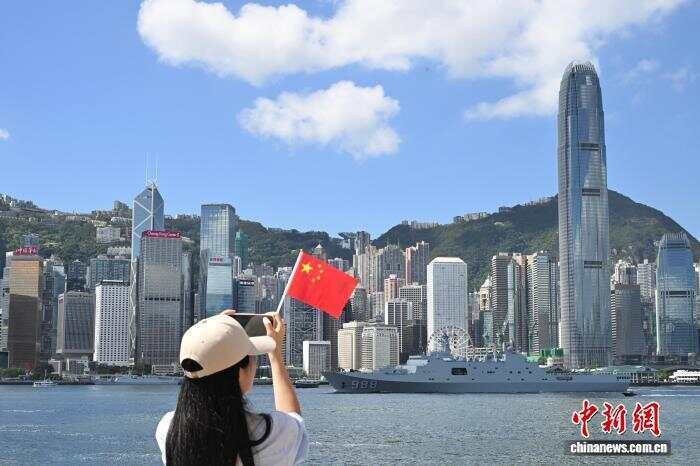 10月3日,海军戚继光舰、沂蒙山舰编队完成出航前的各项准备工作,驶离香港海域,前往柬埔寨、泰国、新加坡三国。尖沙咀码头有民众送别海军戚继光舰、沂蒙山舰编队。图为民众在尖沙咀码头拍摄海军沂蒙山舰。 中新社记者 李志华 摄