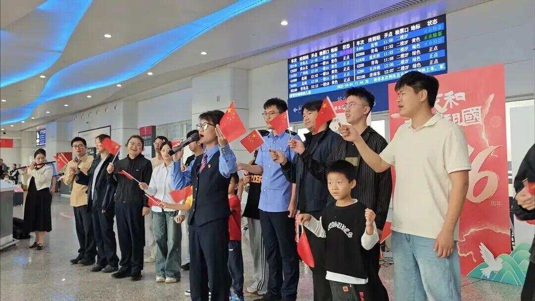 连云港站候车厅举行“喜迎国庆 祝福祖国”快闪活动,吸引众多旅客驻足参与,让文化创作融入旅途。