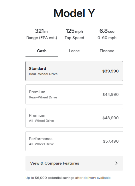 两款新车在配置上进行了多处精简以控制成本,包括取消后排触控屏、手动调节方向盘、更换织物内饰等。Model Y标准版的续航里程从357英里下降至321英里,19英寸轮毂改成18英寸轮毂,可额外花费1500美元选装19英寸轮毂。为了降低成本,新车并未配备特斯拉辅助驾驶系统Autosteer。两款标准版车型均采用后驱系统,0-60mph加速时间为6.8秒。