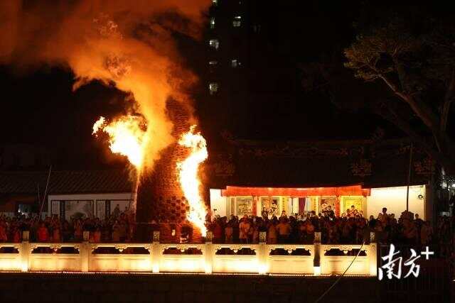 “撒盐了!”随着一声响亮的吆喝,经验丰富的老师傅将粗盐抛向窑顶,噼啪爆鸣声中,火苗骤然窜高,映红了村民和游客的脸庞。6日中秋夜,潮汕各地的烧瓦窑民俗增添了节日氛围感。在潮州枫溪镇湖厦村,一座7.5米高、直径3.3米的瓦窑塔在月光下矗立,迸发出震撼的火光。据介绍,烧瓦窑起源于古时驱虫祈福,也有一说起源于抗击外来侵略,该习俗在当地传袭已久,瓦窑也由村民集资捐建。