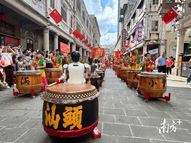 在小公园开埠区、龙眼南路等汕头网红景点,非遗表演已成为节假日的必看项目。英歌舞、舞龙舞狮、二十四节令鼓等潮汕民俗演出轮番上演。其中,机器人AI英歌舞融合传统与创新,表演别具韵味。