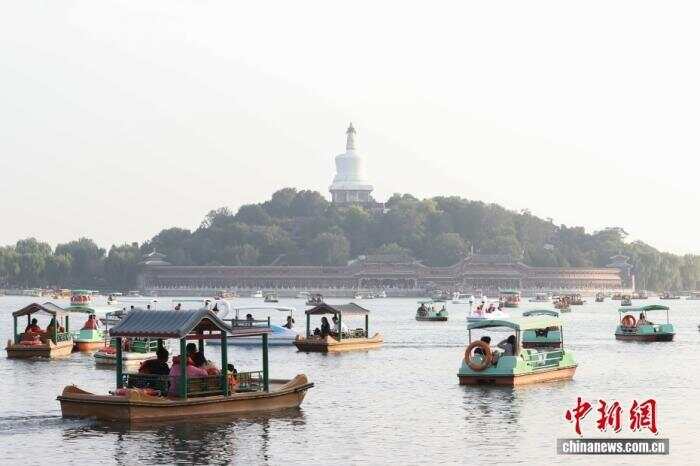10月7日,国庆节、中秋节假期进入尾声,北京北海公园热度不减,不少市民游客在公园乘船游玩。中新社记者 杨郁然 摄