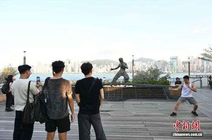 10月8日是2025年中国内地国庆中秋8天长假最后一天。当天,不少游客在香港多地游玩,度过假期。图为游客游览位于尖沙咀的李小龙铜像。 中新社记者 李志华 摄