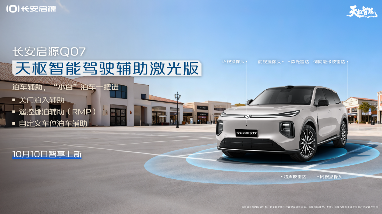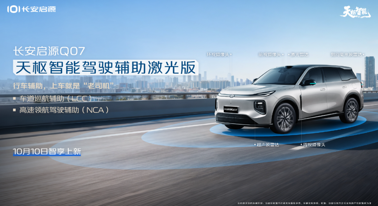 10月10日,长安汽车旗下长安启源Q07天枢智能激光版车型正式上市。该车型在原有L2级辅助驾驶功能的基础上,通过硬件和软件的升级,提升了智能驾驶辅助能力,包括搭载1颗高性能激光雷达、3颗毫米波雷达、12颗超声波雷达和11个摄像头,构建起全景监控式的感知网络。特别地,激光雷达拥有200米超远距离探测能力,实现毫米级精准测距,提升了夜间和恶劣天气下的驾驶安全性。