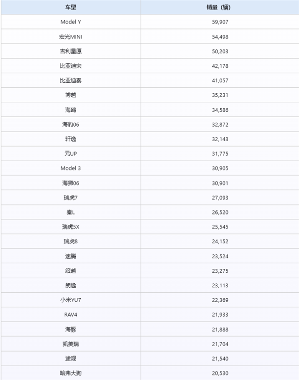 2025年9月,全国乘用车市场销量榜单揭晓,特斯拉Model Y以59907辆的批发销量再度登顶,成为当月销量最高的车型。在销量前十的车型中,新能源车型占据八席,显示出新能源汽车市场的强劲增长势头。宏光MINI和吉利星愿分别以54498辆和50203辆的销量位列第二、三位,比亚迪宋和秦紧随其后,分别以42178辆和41057辆的销量位列第四、五位。
