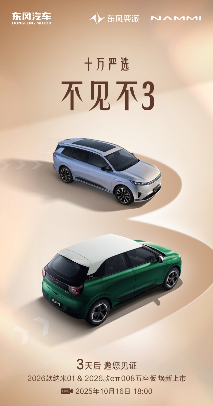 10月13日,东风奕派宣布2026款纳米01和2026款eπ008五座版车型将于10月16日上市。纳米01车型官方指导价为6.58-13.98万元,车身尺寸为4030/1810/1570mm,轴距2660mm,配备12.8英寸智能中控屏,支持外放电功能。新车搭载十合一电驱,最大功率70kW,峰值扭矩160N·m,最高时速140km/h,续航330/430km可选。