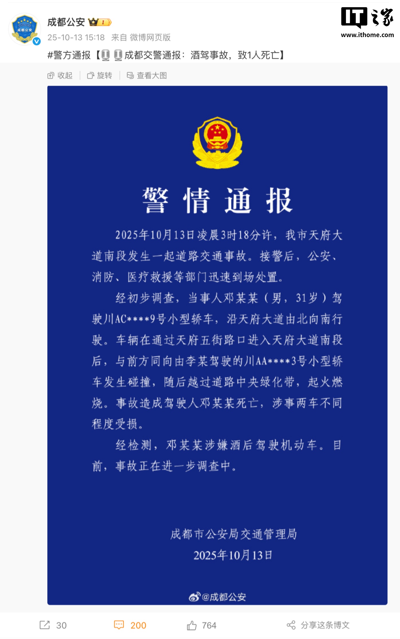 10月13日,成都天府大道南段发生一起严重交通事故。凌晨3时18分许,邓某某驾驶的小型轿车与李某驾驶的另一小型轿车发生碰撞后起火燃烧,造成邓某某死亡,两车受损。经检测,邓某某涉嫌酒后驾驶。目前,事故正在进一步调查中。