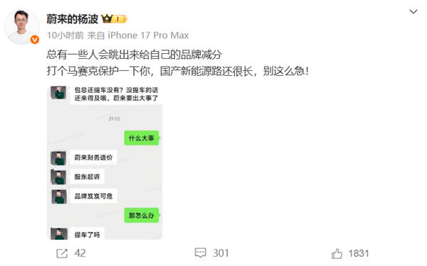 近日,网传一张聊天记录截图显示,某友商销售人员在与客户沟通时转发了关于蔚来的负面新闻,并声称“蔚来财务造假”、“股东起诉”以及“品牌岌岌可危”,建议客户放弃蔚来5000元定金以避免损失。蔚来用户运营负责人杨波在微博上回应此事,表示总有人会给自己的品牌减分,并呼吁国产新能源车的发展需要耐心。