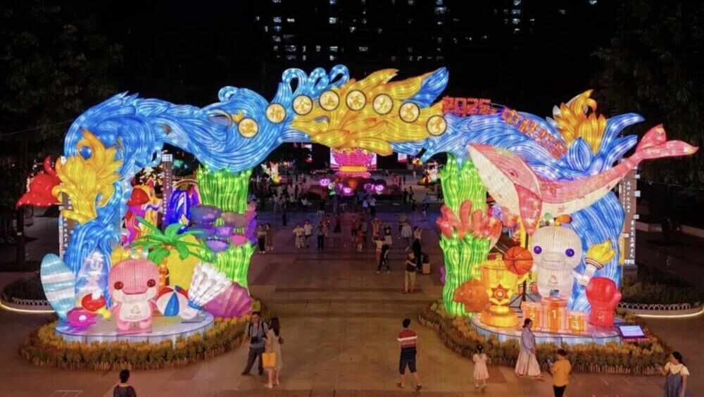 广州文化公园“中秋灯会”融合岭南非遗与全运元素,核心灯组《乘风破浪海天阔》,以彩灯形式动态呈现全运会吉祥物和多项运动项目造型。公园中轴线六组运动主题光雕,勾勒了羽毛球、游泳、举重、田径等运动项目的动态瞬间,打造了彩灯与体育精神交融的视觉盛宴。