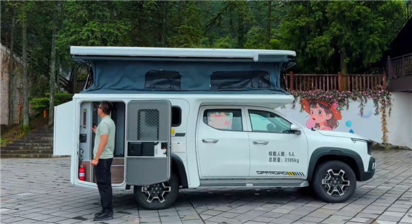 征程者Pro车身尺寸为5560*2185*2090mm,升顶后高度2770mm,双排驾驶室设计可容纳5人,支持C本驾驶,可进入标准地下车库。房厢部分使用电动、全升全降升顶机构,篷布选用了阻燃和环保的材料,共有四层。车内配备1000W电磁炉、微波炉、50L房车专用冰箱、吸塑洗手池及2kW储水式热水器,100L净水箱+50L灰水箱满足日常用水需求。