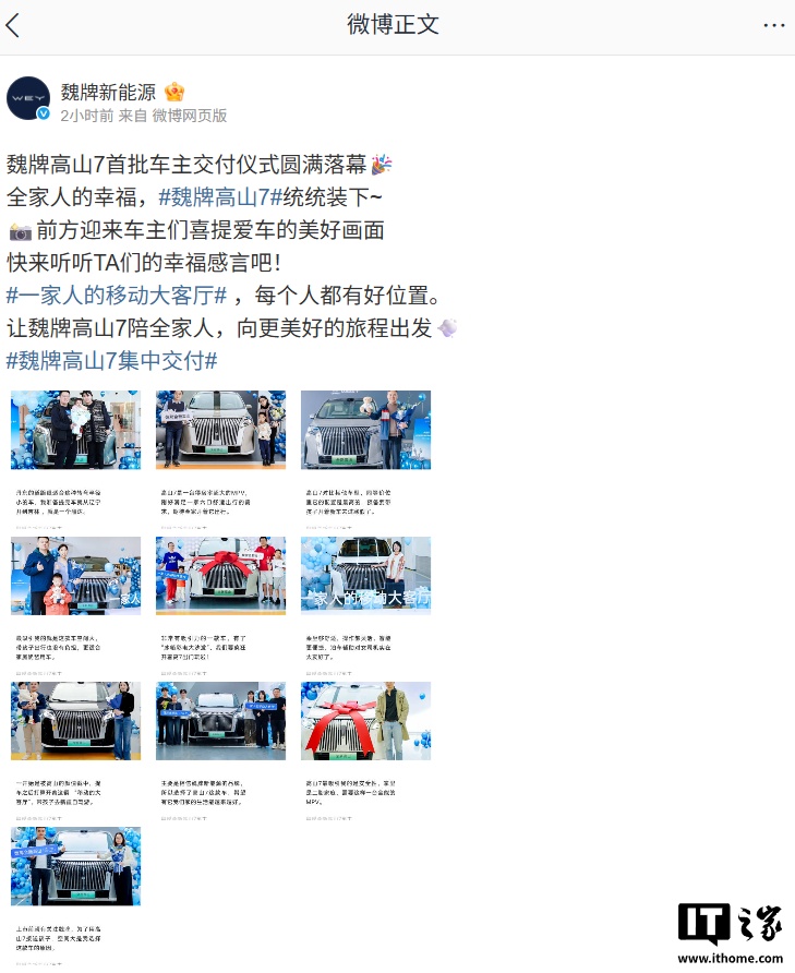 10月19日,长城汽车旗下魏牌新能源宣布,其中大型MPV车型高山7首批车主交付正式启动。该车型于10月15日上市,起售价为28.58万元。高山7延续了家族设计语言,拥有直瀑式镀铬格栅和一体化大灯设计,车身尺寸为5050*1960*1900mm,轴距达到3085mm。