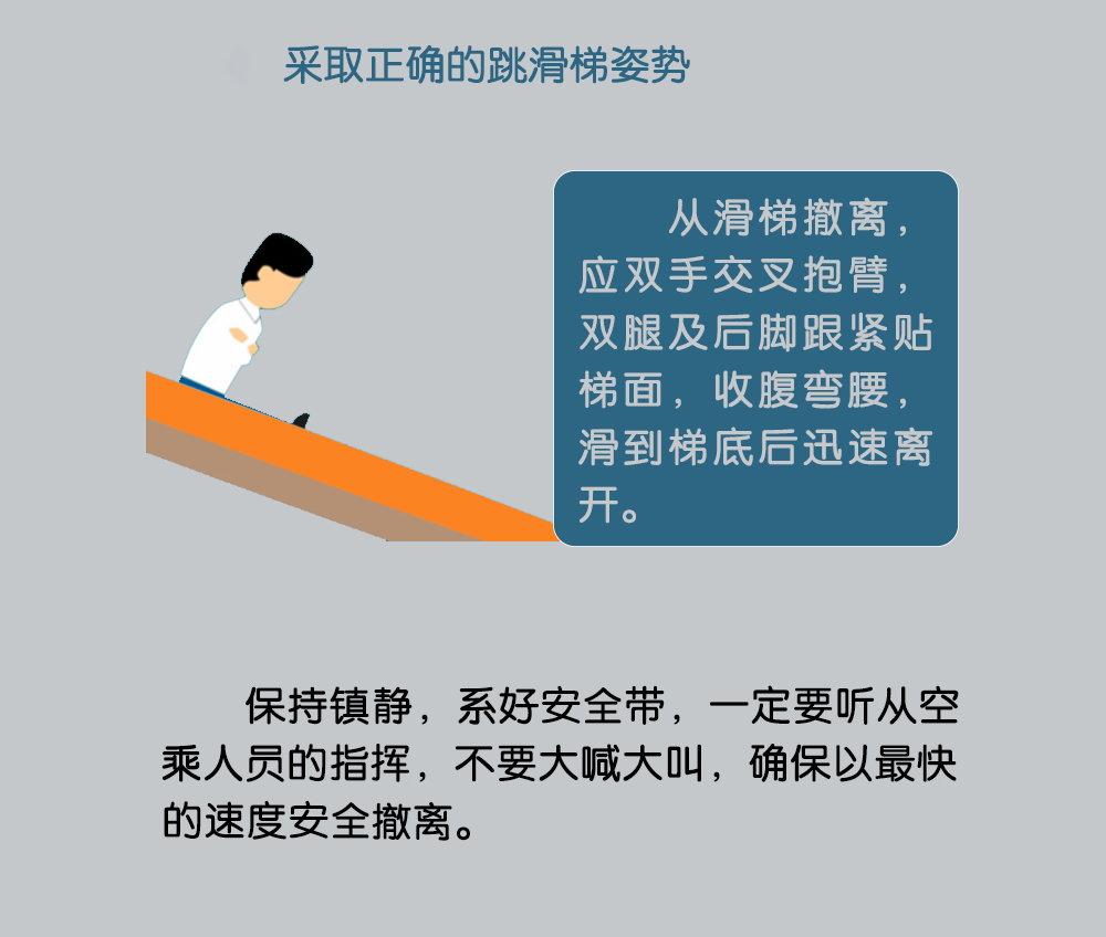 从滑梯撤离,双手交叉抱臂,从舱内跳出落在梯内时手臂的位置不变,双腿及后脚跟紧贴梯面,收腹弯腰,滑到梯底后迅速离开。