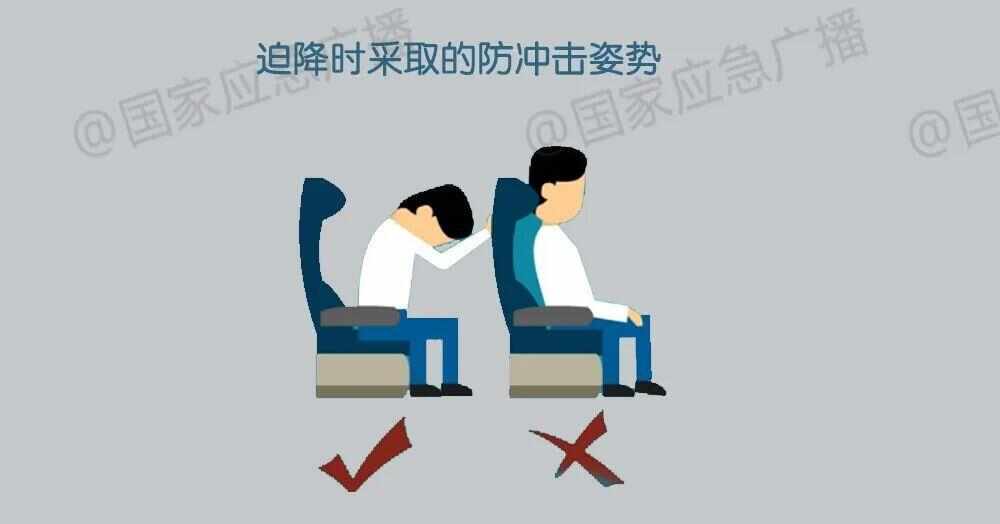 飞机坠地时,会产生巨大的冲击力,应该提前做好准备姿势:小腿尽量向后收,头部向前倾,尽量贴近膝盖。