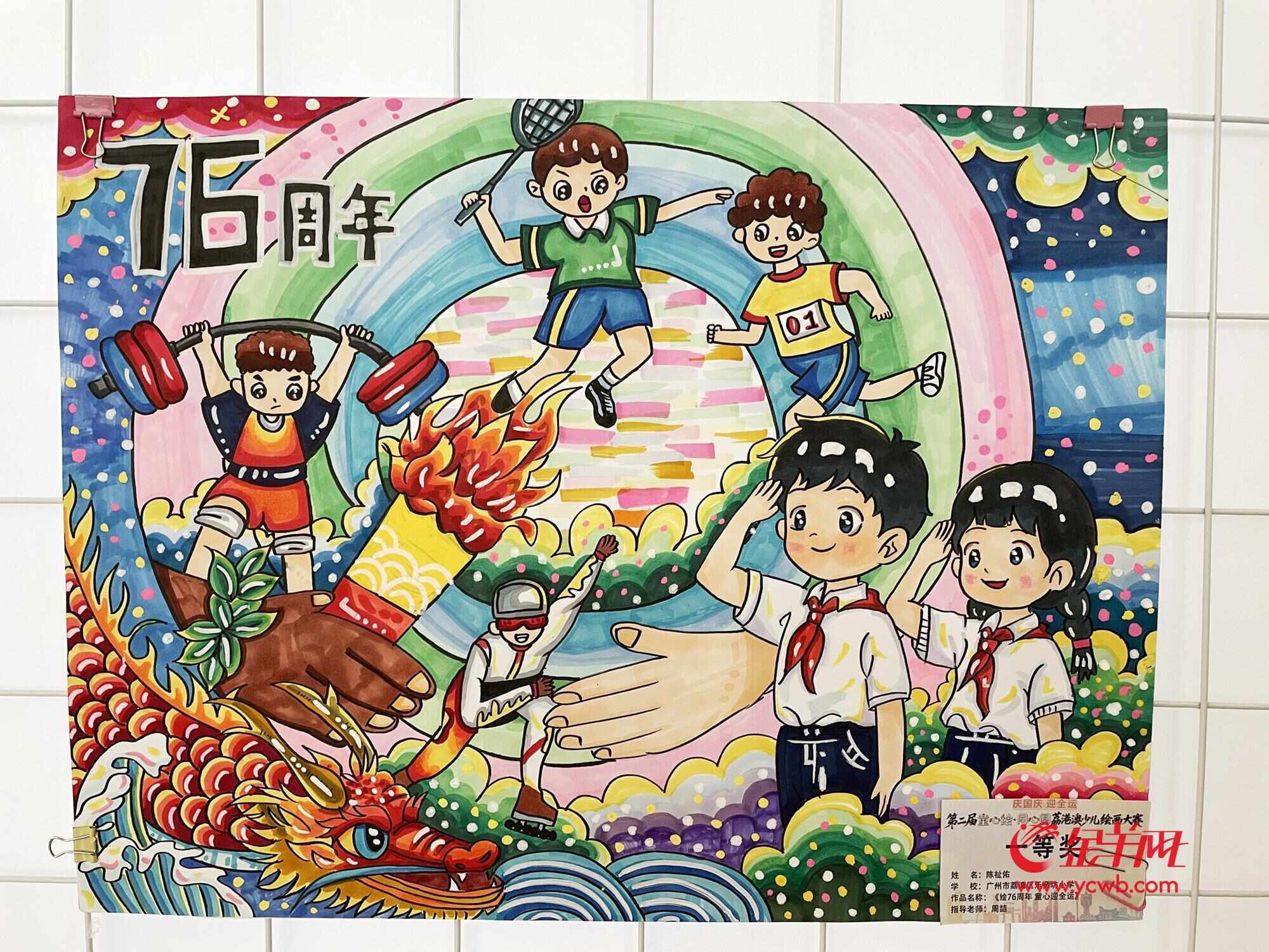 来自广州市荔湾区乐贤坊小学的陈祉佑绘画了作品《绘76周年 童心迎全运》,该作品在本次比赛中获得了一等奖。“获得一等奖是意料之外。”陈祉佑介绍,“画中绘画了多个不同颜色的圆圈,有两个手掌,其中一个手掌举着火炬,寓意拥抱同心圆。”