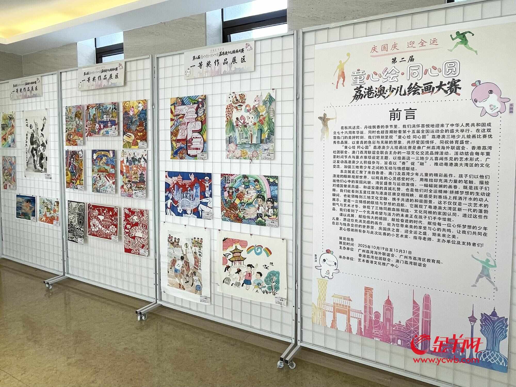 10月19日,由广州荔湾海外联谊会、广州市荔湾区教育局、香港荔湾社团联会、澳门荔湾联谊会联合主办,艺术香港文化推广中心承办的第二届“童心绘·同心圆”荔港澳少儿“庆国庆 迎全运”绘画大赛颁奖礼在广州荔湾粤剧艺术博物馆举行。获奖学生作品同步在现场展示,并于本月在粤剧艺术博物馆展出。