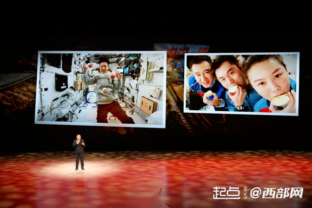 延安市安塞区南沟村原驻村干部张光红分享了延安苹果“飞”上太空的喜讯,神舟二十号乘组在中国空间站向活动送来美好祝愿。