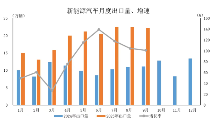 在国内市场,新能源汽车的销量表现尤为强劲。2025年9月,国内销量达到138.2万辆,环比增长18%,同比增长17.5%。1-9月累计销量为947万辆,同比增长28.1%。出口方面,新能源汽车同样表现不俗,9月份出口量为22.2万辆,同比增长1倍。1-9月累计出口量达到175.8万辆,同比增长89.4%。