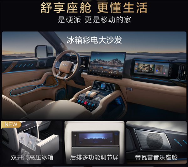 豹8大五座版取消了三排座椅,车内的可用空间进一步拓展。二排腿部空间增加100mm,纵向乘坐空间达970mm,二排和副驾座椅均配备四向可调节腿托,新车还增加了双开门高压冰箱,乘坐舒适性明显提升。后备箱储物空间955L,后排放倒后纵深1897mm,秒变双人大床房,车辆的使用场景也随之拓展。
