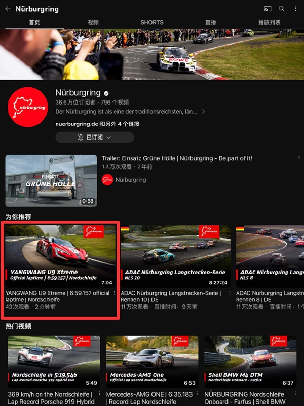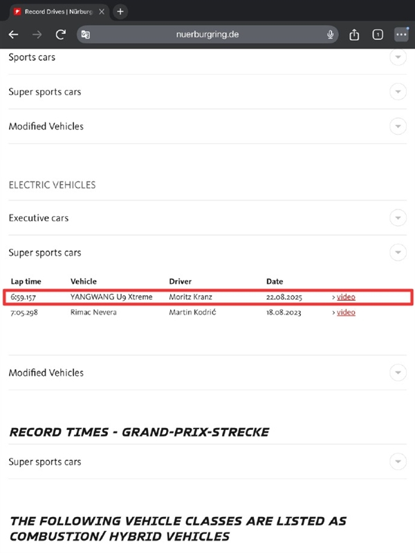 10月21日,仰望U9Xtreme在纽博格林北环赛道上创下了量产电动车的新纪录,以6分59.157秒的成绩成为纽北量产电车圈速第一。同时,该车还以496.22km/h的速度刷新了全球超跑的最高极速记录,成为“极速+圈速”双料冠军。