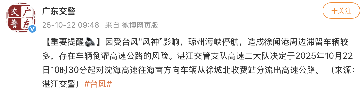 10月22日,记者从广东交警获悉,因受台风“风神”影响,琼州海峡停航,造成徐闻港周边滞留车辆较多,存在车辆倒灌高速公路的风险。湛江交管支队高速二大队决定于2025年10月22日10时30分起对沈海高速往海南方向车辆从徐城北收费站分流出高速公路。