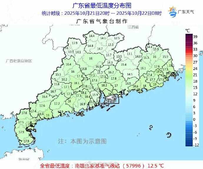 根据广东省气象部门监测,截至22日早晨,广东大部气温继续走低,其中南雄国家基准气候站录得12.5℃低温,为22日早晨广东范围内国家基本气象站当中的最低气温。在广州,广州国家基本气象站22日早晨录得最低气温16.7℃,为今年下半年以来该站所录得的最低气温。
