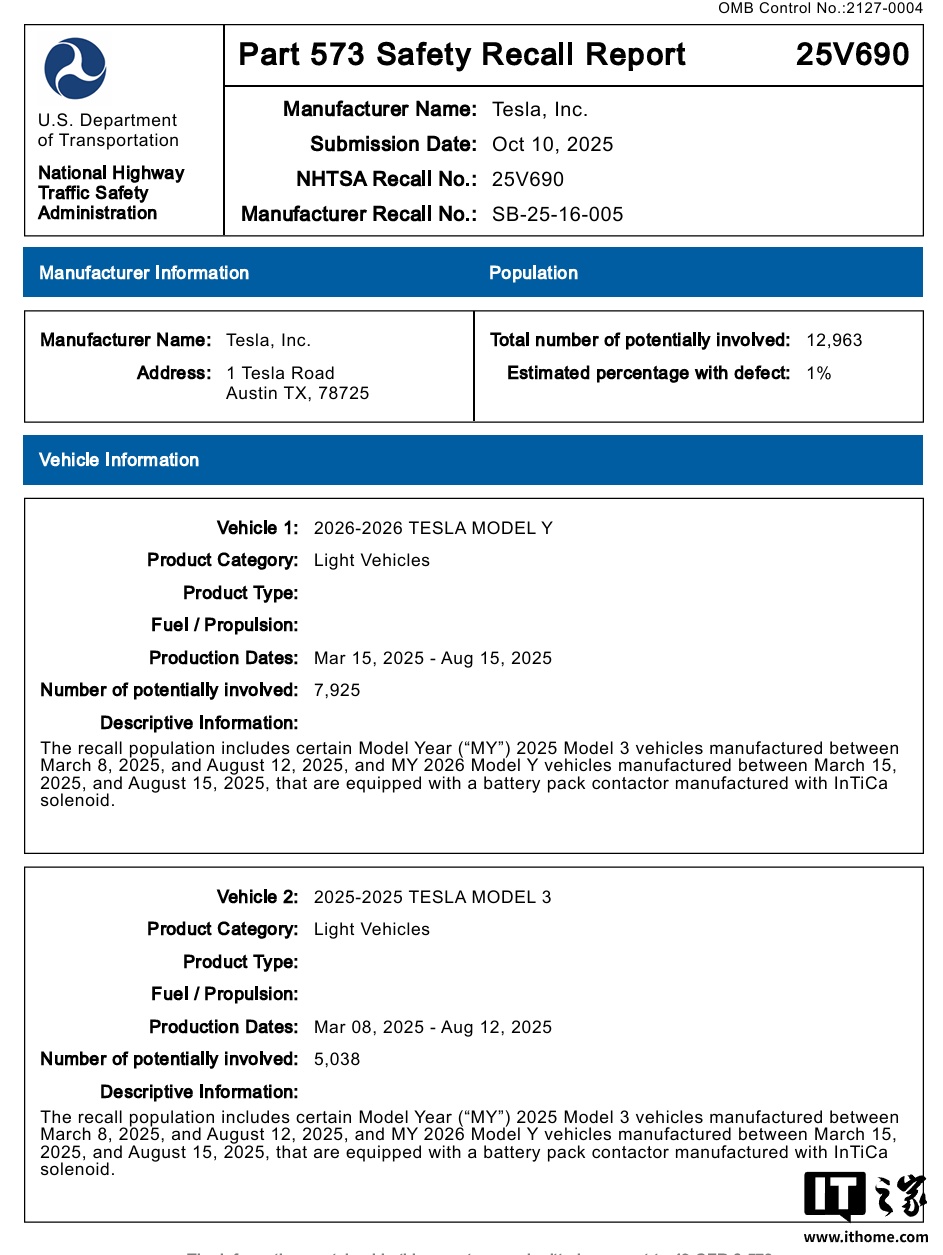 10月22日,特斯拉宣布在美国召回部分2025款Model 3和2026款Model Y车型,共计12963辆。召回原因是电池连接故障可能导致动力丧失,增加碰撞风险。受影响车辆安装了由InTiCa制造的电磁线圈接触器,可能因线圈连接不良而意外断开。特斯拉表示,该问题发生前不会有任何预警,但当动力丧失时,车辆界面会立即显示警报,并提示驾驶者安全靠边停车。