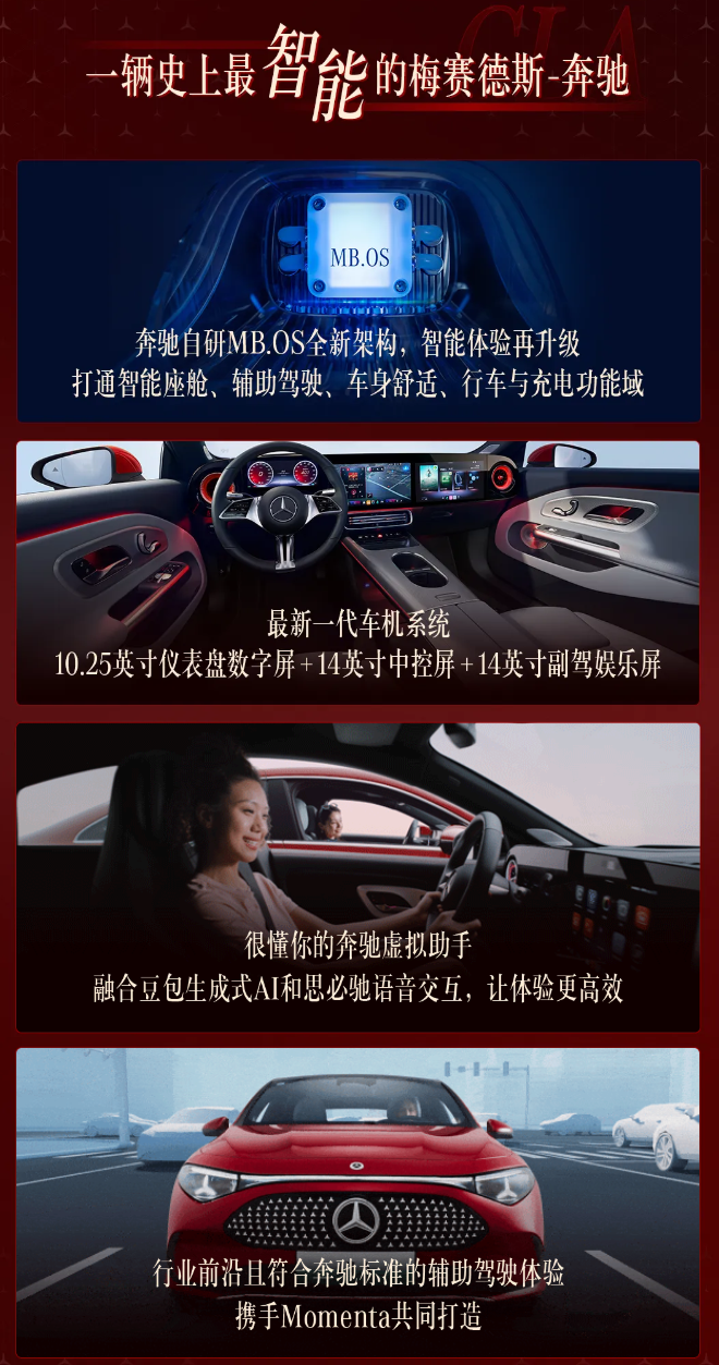 奔驰全新纯电CLA被誉为“史上最智能的梅赛德斯-奔驰”,采用奔驰自研MB.OS全新架构,整合智能座舱、辅助驾驶、车身舒适、行车与充电功能域。新车搭载最新一代车机系统,配备10.25英寸仪表盘数字屏、14英寸中控屏和14英寸副驾娱乐屏,融合豆包生成式AI和思必驰语音交互技术,提供辅助驾驶功能,与Momenta共同打造。