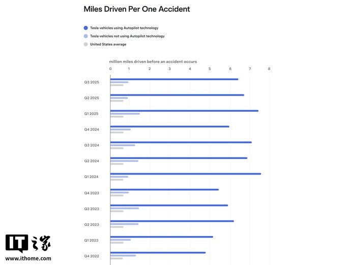 特斯拉2025年第三季度安全报告出炉,数据显示,开启Autopilot功能的特斯拉车辆事故频率显著低于美国全国平均水平。具体来看,Autopilot开启状态下,特斯拉车辆每行驶636万英里(约1023.5万公里)才发生一次交通事故,而美国全国平均每70.2万英里(约113万公里)即发生一起机动车交通事故。这一数据较2024年第三季度的700万英里(约1126.5万公里)有所下降。