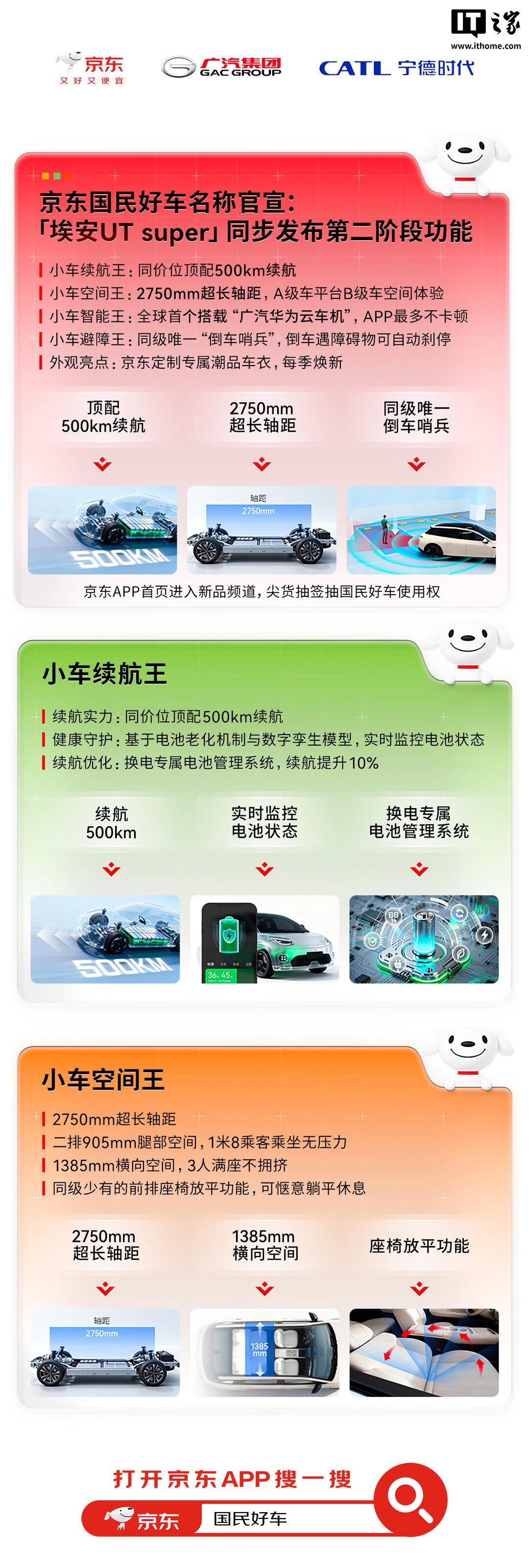 今日,广汽集团联合京东、宁德时代推出的“国民好车”车型名称正式官宣为埃安 UT super。该车型搭载了宁德时代的巧克力换电技术,支持99秒快速换电,并拥有500km的续航能力。埃安 UT super 的轴距为2750mm,提供宽敞的车内空间,包括二排腿部空间905mm和横向空间1385mm,同时具备前排座椅放平成床的功能,满足用户休息需求。