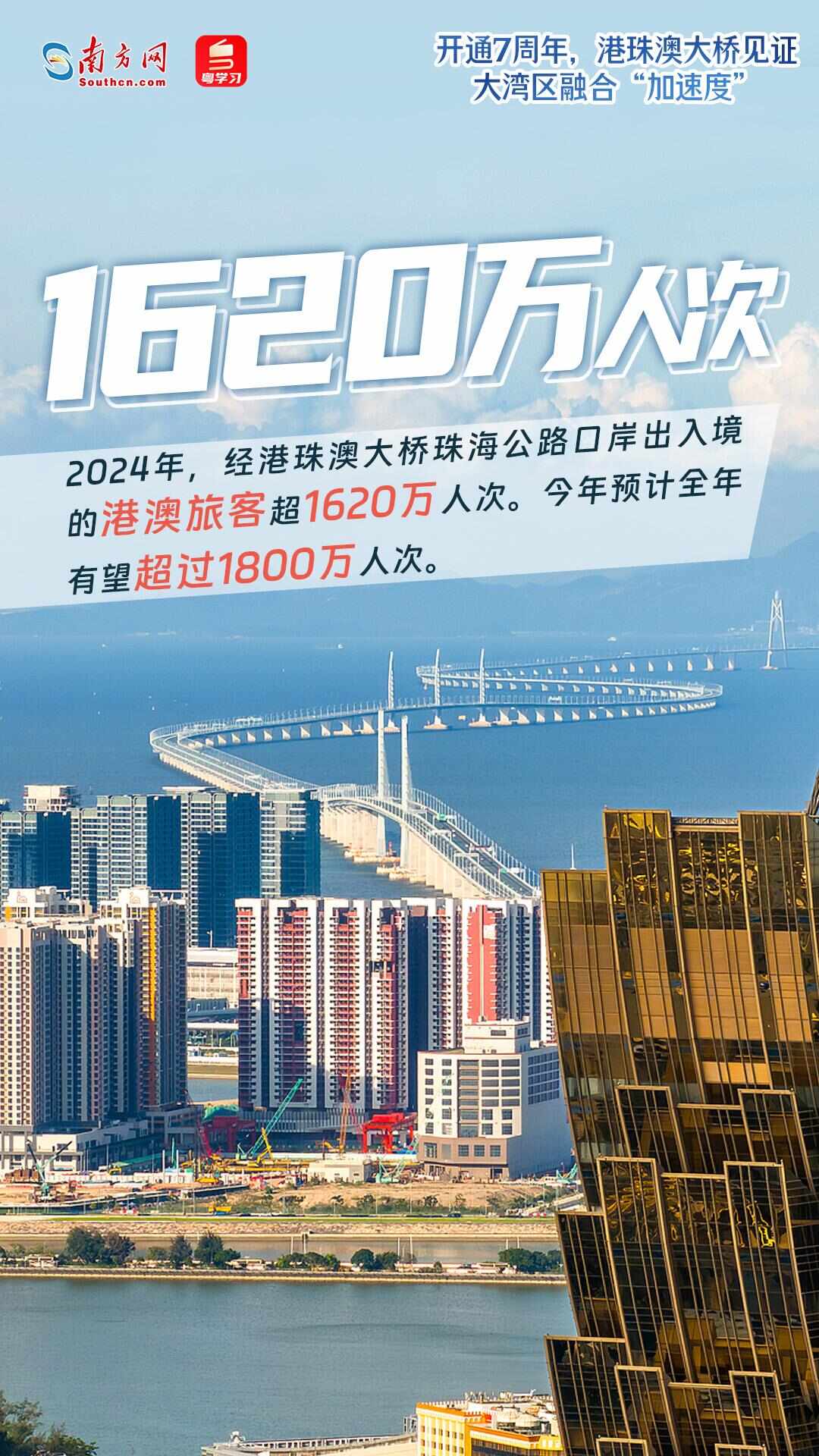 在港珠澳大桥的连接下,粤港澳三地车程大幅缩短、居民出行更加便利、物流运输成本明显降低:港珠澳“1小时生活圈”形成;经港珠澳大桥珠海公路口岸往来粤港澳三地的旅客数量已超9334万人次,车辆超1942万辆次;日均超160万个包裹经港珠澳大桥出口,通达全球……7年来,港珠澳大桥不断刷新着车流量和客流量纪录,车畅、人旺、货兴成为常态,有力促进了大湾区互联互通和高质量发展。
