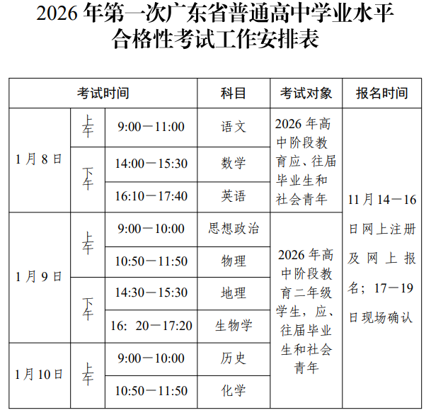 10月23日,广东省教育考试院宣布,2026年第一次广东省普通高中学业水平合格性考试报名将于11月14日开始。网上注册和报名时间为2025年11月14日至16日;报名点现场确认时间为2025年11月17日至19日。考生从2025年12月30日起可登录报名系统考生端自行打印准考证。