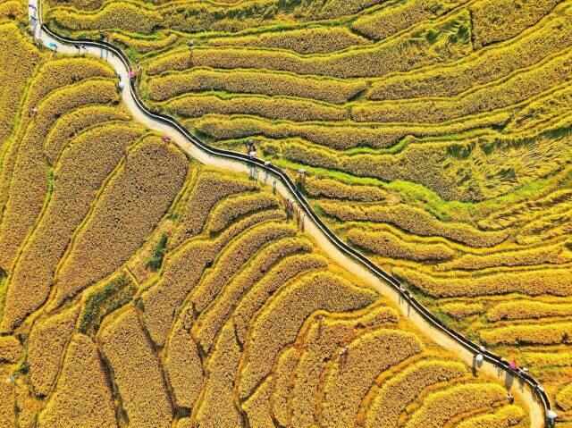 广东清远欧家梯田已是金黄一片,成熟的稻谷沿着山坡连绵起伏,从空中俯瞰,美如画卷。南方+记者 肖雄 黄津 摄
