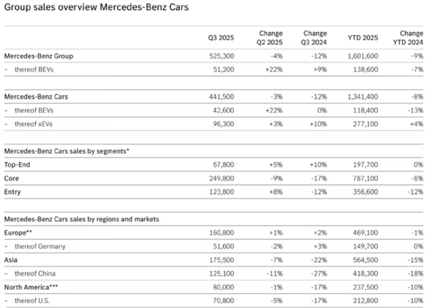 近日,德国百年车企梅赛德斯-奔驰面临转型挑战和业绩低迷,实施了史上最大规模的裁员计划。据报道,已有约4000名员工接受遣散方案离职,其中资深管理人员最高可获得50万欧元的补偿金。奔驰计划到2027年通过外包决策、不填补空缺职位等方式,每年节省大约50亿欧元。这一裁员计划背后,是奔驰集团销量和营收表现不振的现实。第三季度全球销量同比、环比分别下滑12%、4%,前三季度累计销量同比减少9%。去年总营收同比下滑4%,净利润同比大跌28.4%。
