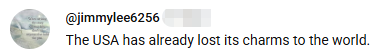 网友@jimmylee6256说道:“美国已经失去了对世界的魅力。”