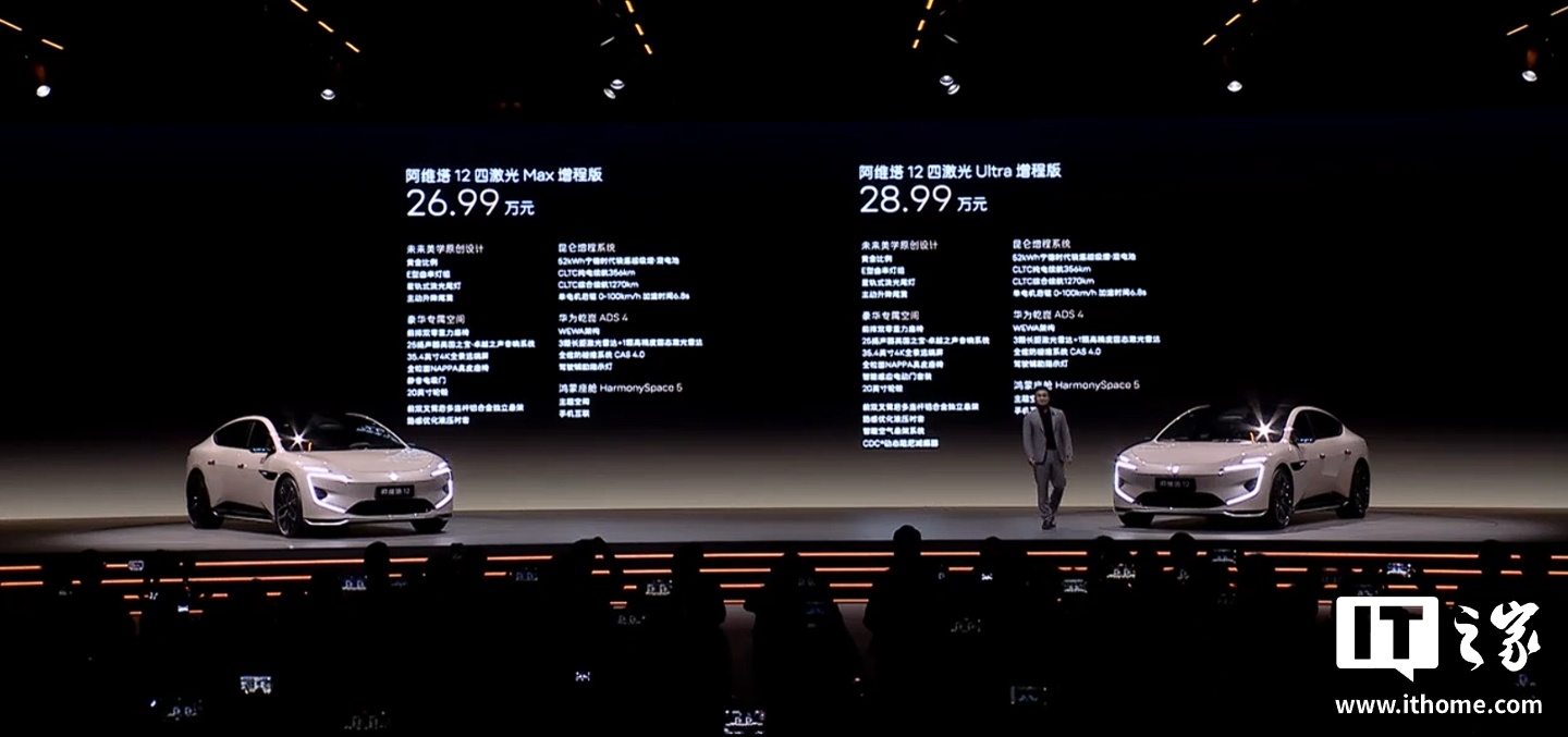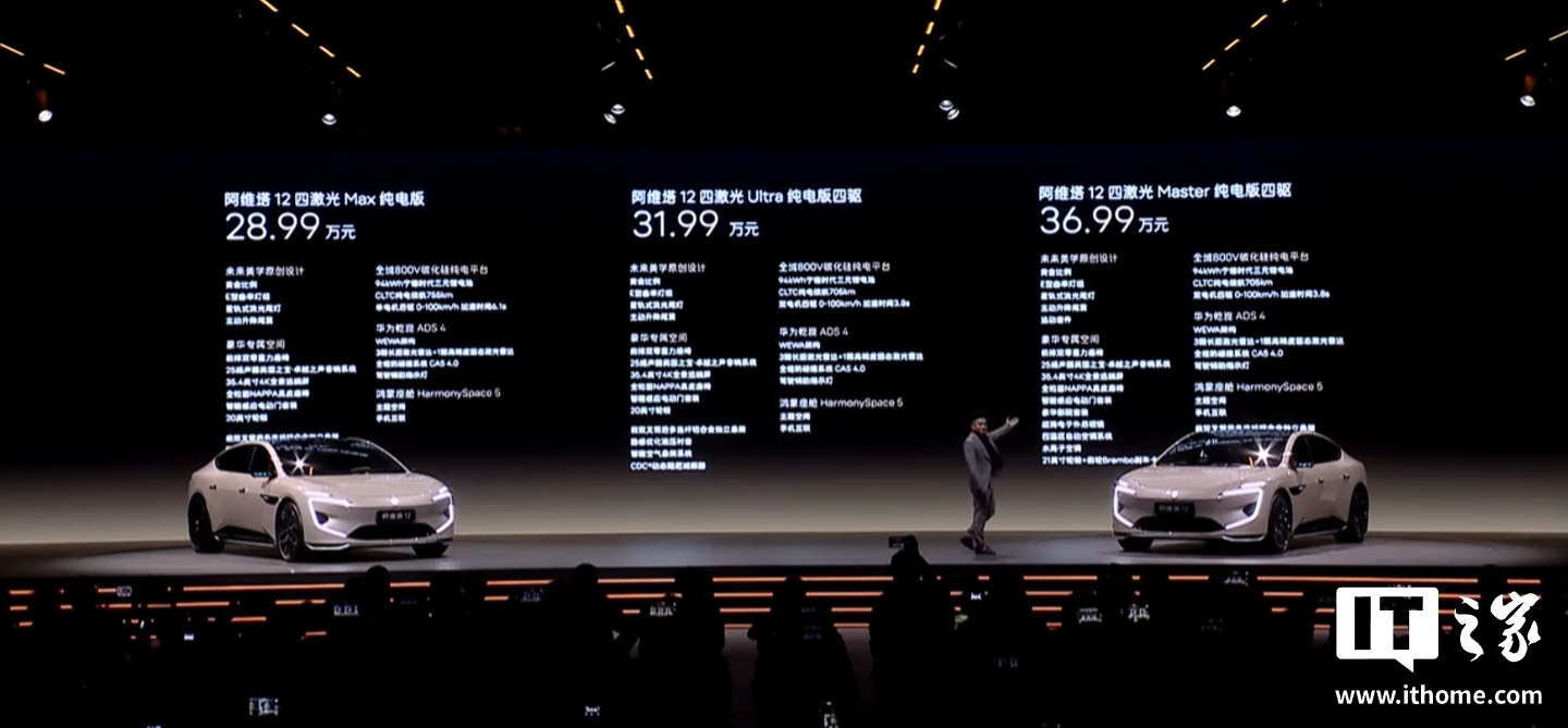 新车预装华为乾崑智驾ADS 4,采用全新WEWA技术架构,端到端时延缩短50%、重刹率降低70%、通行效率提升20%。阿维塔12四激光版还拥有鸿蒙座舱HarmonySpace 5,提供皓白、曜灰、曜黑、云紫、曦金灰、曦紫(哑光色)外观配色可选。新车标配全景远端屏、前排双零重力座椅、智能升降快充浮岛、智能电动升降尾翼、25扬英国之宝·卓越之声音响系统,全系可选豪华影院套装、超清电子外后视镜。