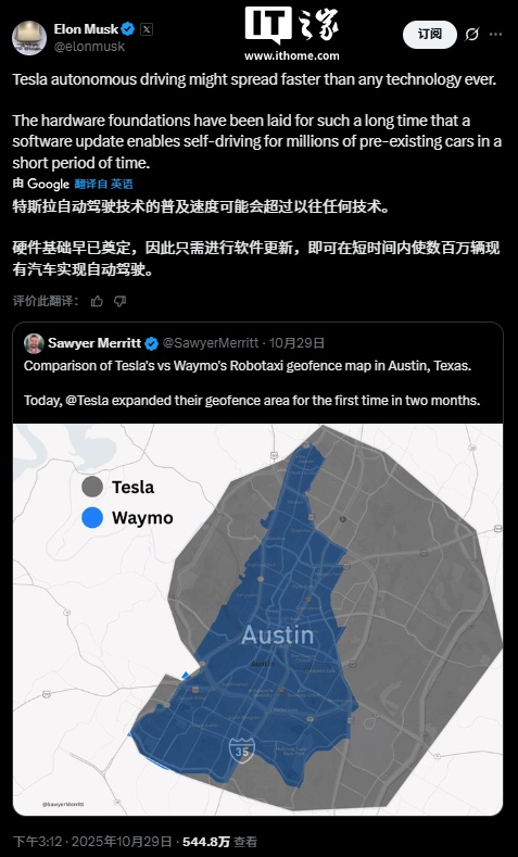 特斯拉在奥斯汀的Robotaxi服务区域已扩大至243平方英里,几乎是两个月前覆盖范围的三倍,远超Waymo约90平方英里的服务区域。这是特斯拉自8月以来在奥斯汀进行的第二次重大服务范围扩展,显示了公司在自动驾驶出行市场抢占主导地位的决心。随着特斯拉与Waymo竞相证明技术规模化能力和可靠性,真正的竞争或许在于谁能以更快的速度在整个车队中实现技术部署。