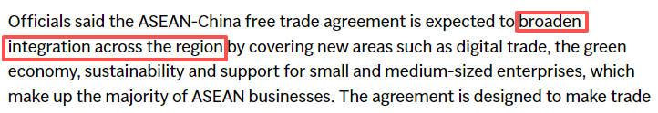 美联社的报道认为,中国-东盟自贸区3.0版升级议定书的签署将为本已蓬勃发展的区域贸易“锦上添花”。
