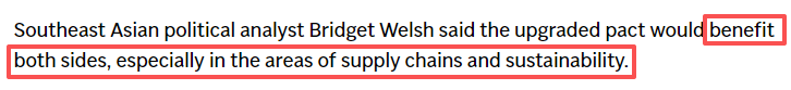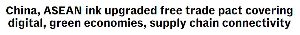 报道还援引分析师的话说,中国与东盟都能在升级后的自贸协定中获益,特别是在供应链和可持续发展领域。